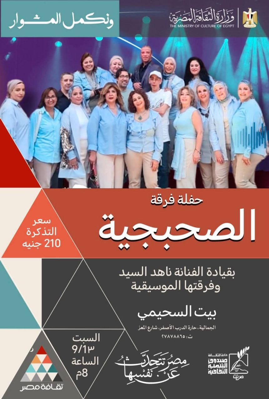 في إطار رسالته الرامية إلى إعادة إحياء مراكز الإبداع التابعة لها، وتحويلها إلى مساحات فنية وثقافية نابضة بالحياة، ينظم صندوق التنمية الثقافية حفلاً موسيقيًا جديدًا لفرقة “الصحبجية” بقيادة الكاتبة الصحفية والفنانة ناهد السيد، وذلك في الثامنة من مساء غداً (السبت ١٣ سبتمبر الجاري ببيت السحيمي بشارع المعز لدين الله الفاطمي.