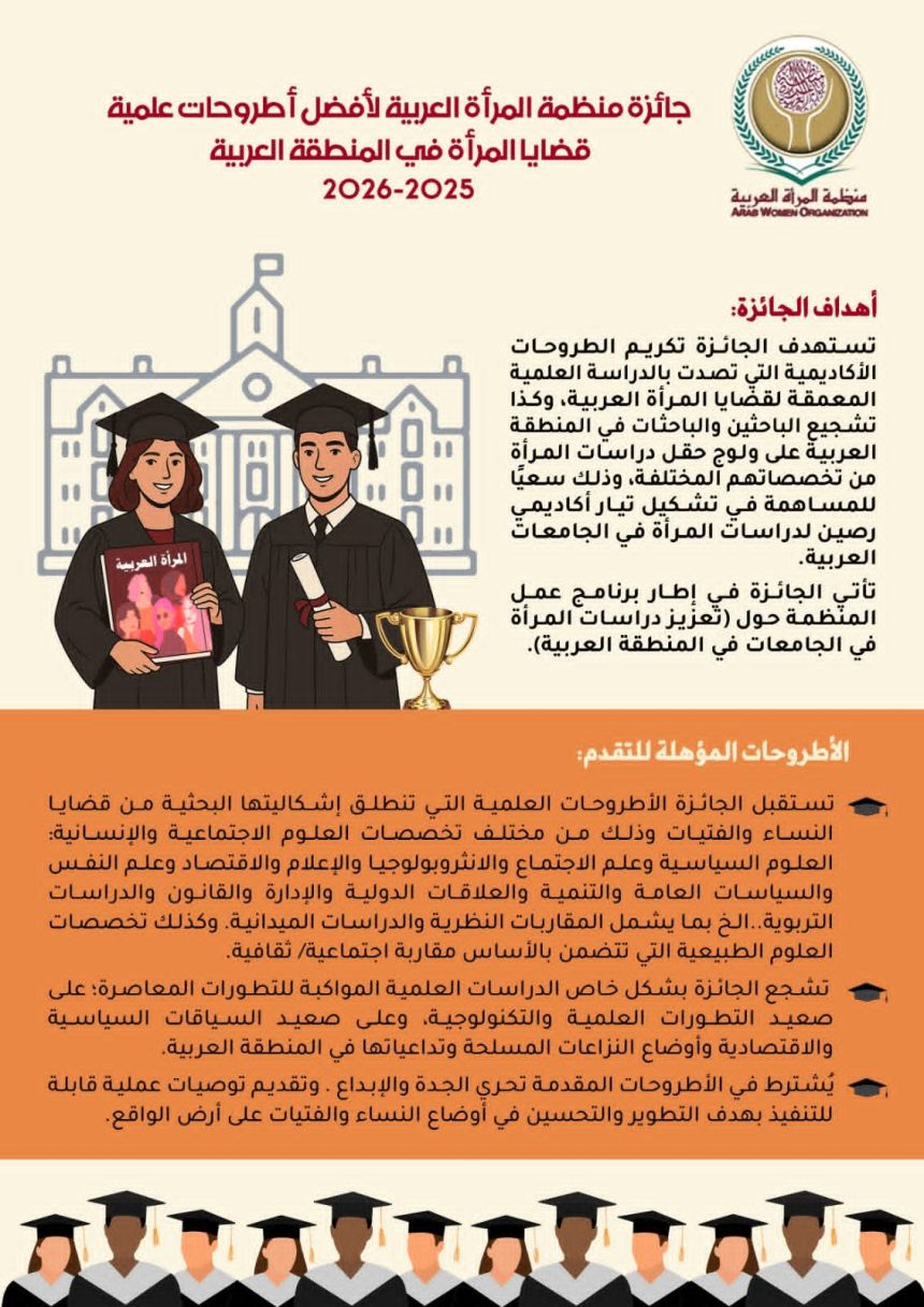 تعلن منظمة المرأة العربية عن إطلاق جائزتها لأفضل أطروحات علمية حول قضايا المرأة في المنطقة العربية لعام (2025- 2026 )